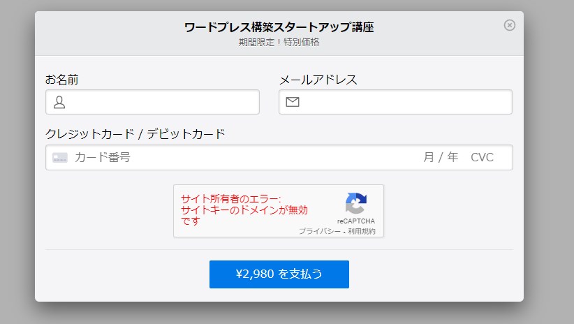 ステップ1reCAPTCHA(サイト所有者のエラー: サイトキーのドメインが無効です) https://www.google.com/recaptcha/admin/ reCAPTICHAの設定をクリック 正しい設定に修正する。 修正後、一番下までスクロールし、保存ボタンをクリックする。 正常に表示されていることを確認
